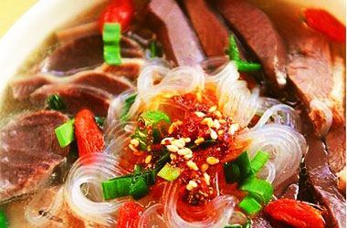 4. 把粉丝放入烫粉丝的勺里,在汤里烫一两分钟,倒进碗里。