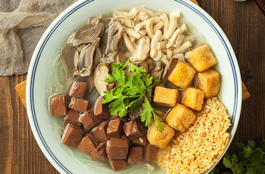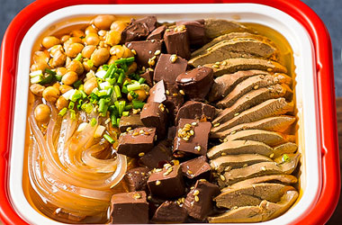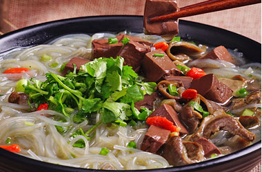 切成小块或(条)的鸭血和粉丝。油果子、葱姜丝、虾米、香菜、鸭内脏(包括鸭胗、鸭肠、鸭肝等等)。精盐、味精、鸡精、香油(或辣油)各适量。