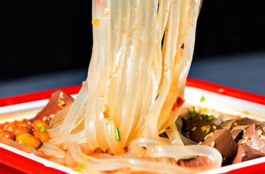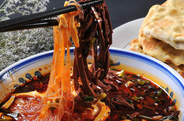 5.再捞出适量的鸭血和油果子放进碗,把切好的熟鸭肠、鸭肝放在粉丝上,夹几根香菜,挖勺辣油,用筷子搅一下,一碗色香味美的鸭血粉丝汤就做好了。