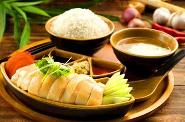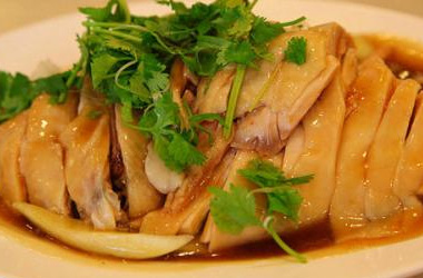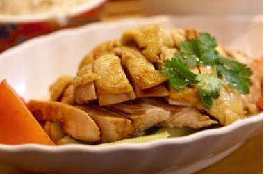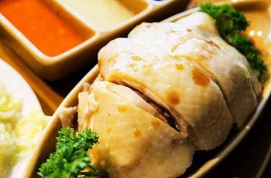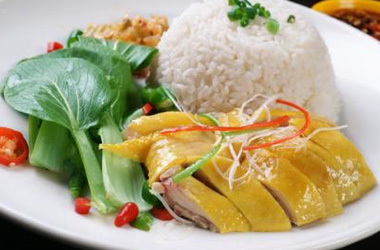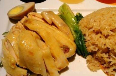 海南鸡饭,就是白切鸡搭配用鸡油和煮鸡汤烹制的米饭。冠以海南之名当然是因为起源于海南,也称为文昌鸡饭。是以海南当地的文昌鸡,用白切鸡做法,烹煮至九成熟,以保持肉质嫩滑,浸入冰水冷却,使其鸡皮和鸡肉之间有一层透明的凝脂,通常佐以黑酱油及蒜茸辣椒酱为美味。海南鸡饭中的饭也是非常重要的角色,绝对不是一碗简单的白饭。优质大米加入了滋润的鸡油,用之前的煮鸡汤烹煮出来,成为鸡油香饭,喷香扑鼻。是早年下南洋的淘金客们,将这个菜式带到了马来西亚、新加坡、泰国和香港等地,从而在异地发扬光大!