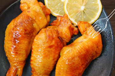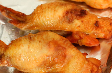 8.取出,翻面刷一层烧烤酱,一层蜂蜜,继续烤10分钟。这个时候把翅尖用锡纸包起来,防止烤焦了。