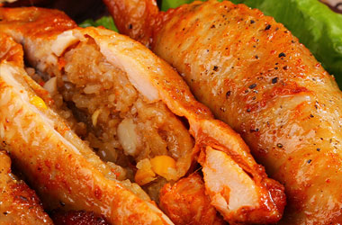 5.把炒饭塞入鸡翅中,大概塞满鸡翅的三分之二即可,防止烤制过程中爆出来。鸡翅口用牙签封住。