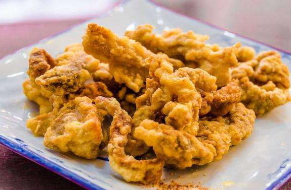 椒盐里脊,色泽金黄,外焦里嫩,用刀拍松里脊肉,以使肉不易卷起,容易入味,炸肉时注意要用中火。